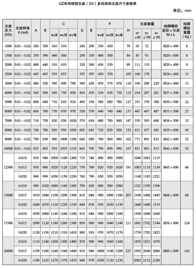 3、QZ系列球型支座的主要技術(shù)性能: a、支座反力(豎向承載力)分為 16級(jí):1000、1500、2000、2500、3000、4000、5000、6000、7000、 8000、 9000和10000、 12500、 15000、 17500、 20000KN。