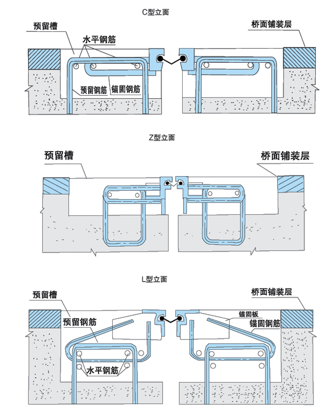 形式代號一MZL表示模數式、直梁連桿鏈條型:(C、Z、F、L>表示異型鋼材的形狀 標準代號一GQF為交通行業(yè)標準規定的伸縮裝置代號 例1、GQF~C60(CR)表示交通行業(yè)標準推薦的C型、伸縮量為60mm氣丁膠型伸縮裝置。